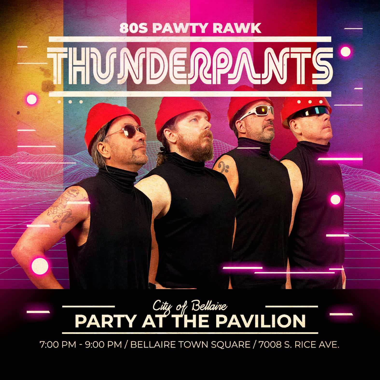 Bring your chairs and blankets and join us for a free concert and a night of fun with Houston’s Baddest 80s Band- ThunderPants. Show time: 7pm to 9pm.